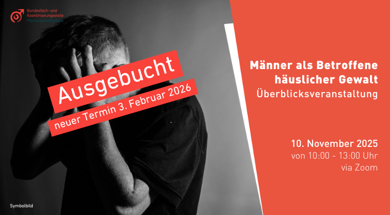 Im Rahmen dieser Veranstaltung erhalten Sie einen Überblick über aktuelle Zahlen und Hintergründe zu Männern als Betroffene häuslicher Gewalt aus Wissenschaft und Praxis. Darüber hinaus möchten wir u. a. folgende Fragen diskutieren: Warum fällt es Männern schwer, Hilfe in Anspruch zu nehmen? Welche Rolle spielen dabei gesellschaftliche Rahmenbedingungen und tradierte Männlichkeitsbilder?